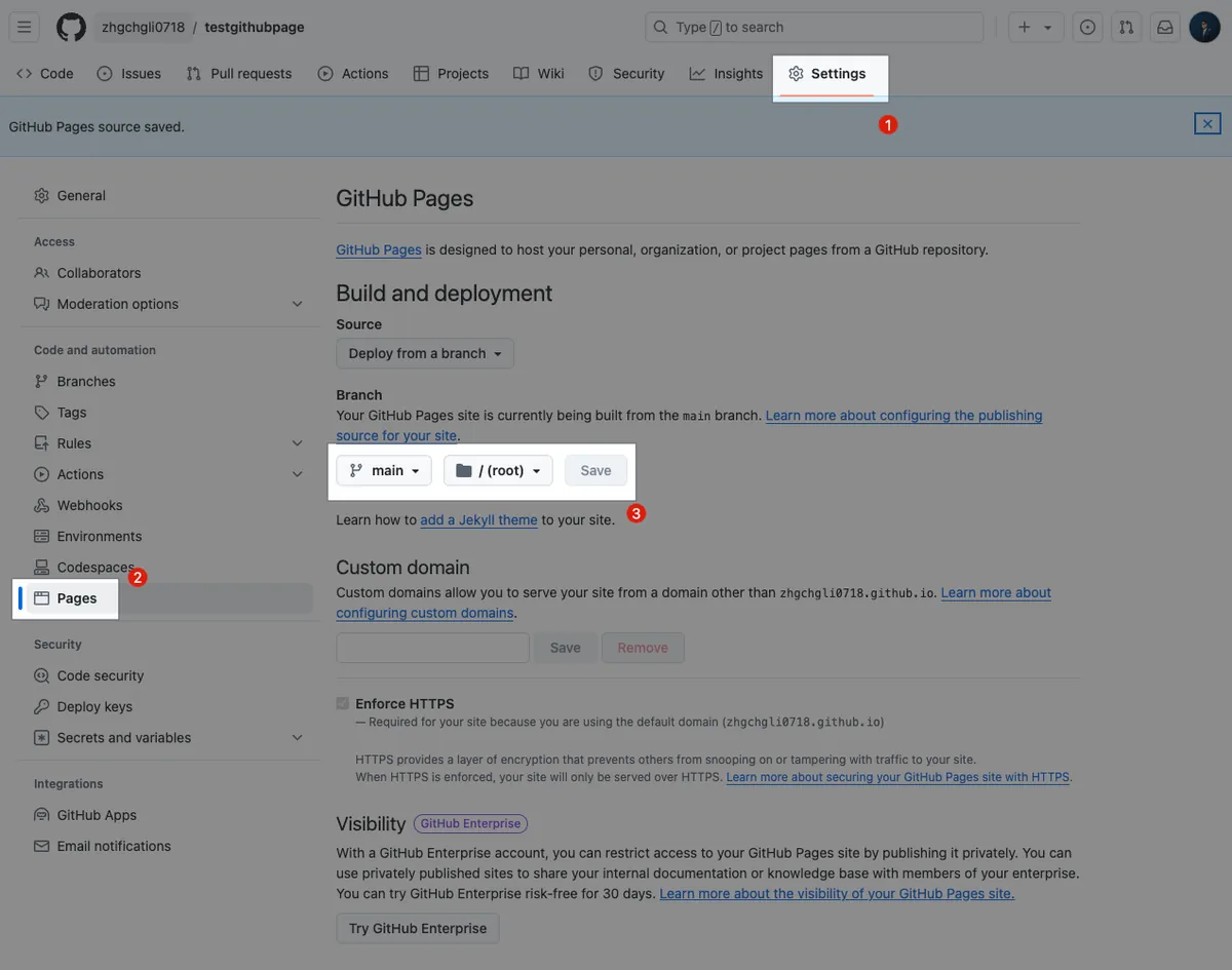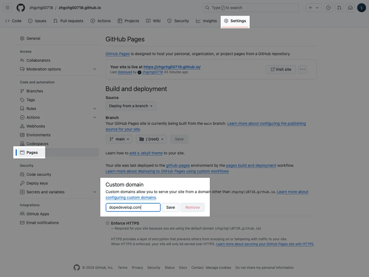 Next is the main point of this article: GitHub Pages custom domains. As mentioned earlier, by default, we can only use your-username.github.io as the main domain for your static website; other repositories can only be accessed via /path and cannot create a second *.github.io domain.