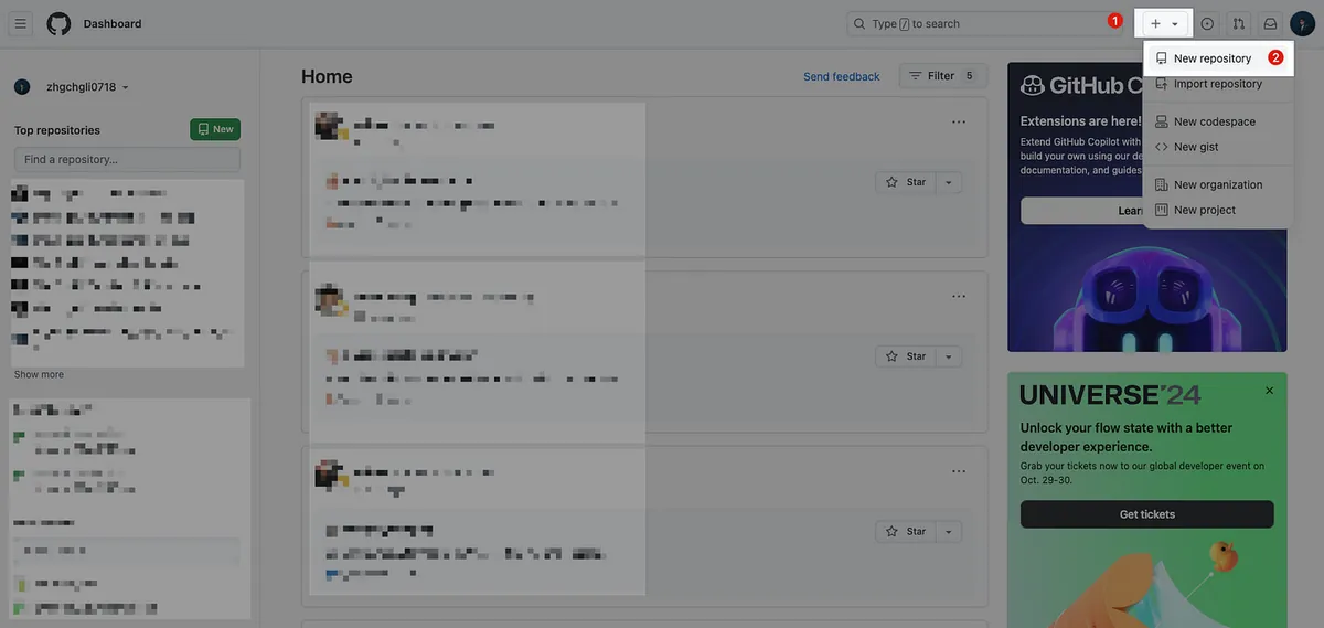 - After logging into Github, select the “+” icon at the top right -> “New repository”