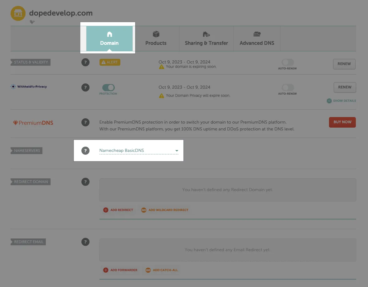 Confirm Domain -> NAMESERVERS -> Select “Namecheap BasicDNS”:
