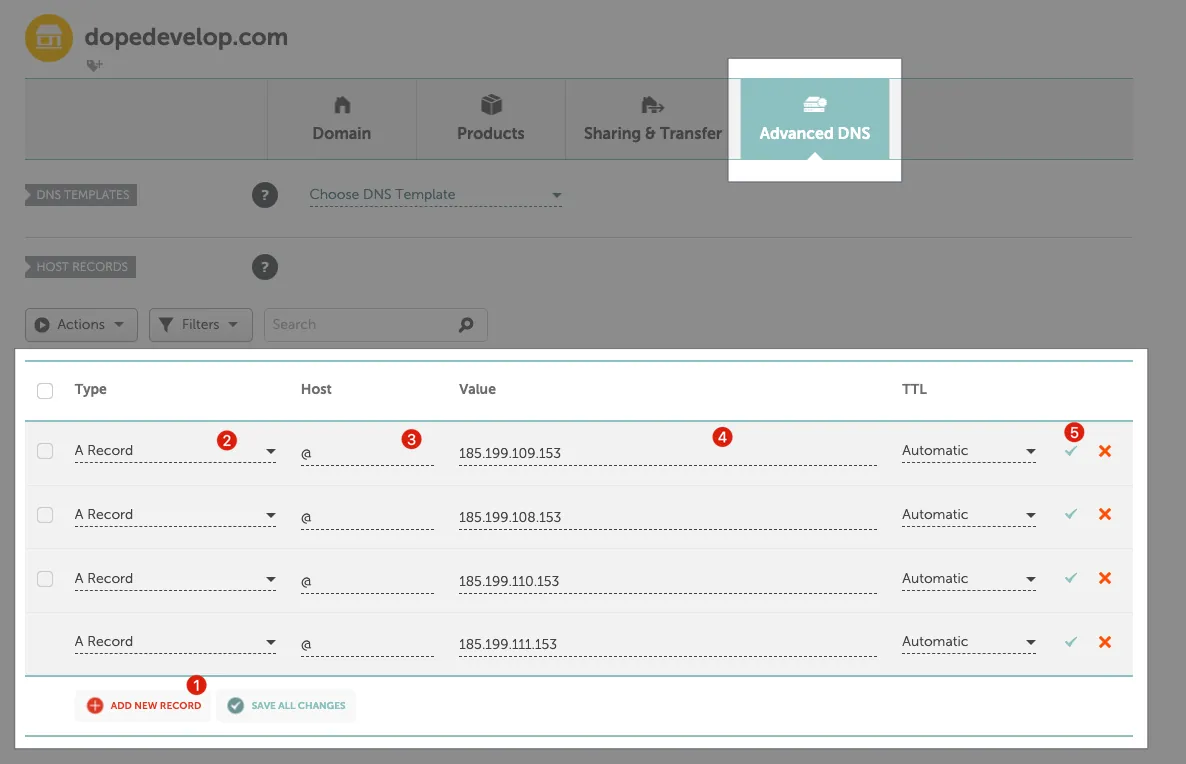 Switch to “Advanced DNS” -> Add A Record: