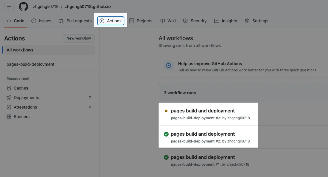 As mentioned earlier, Github Pages requires deployment; it won’t appear just by saving files. We can click on the “Actions” tab at the top of the Repo to check the deployment progress. When the orange light 🟠 turns into a green checkmark ✅, it means the deployment is complete.