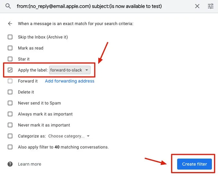Next, set the action for emails that meet this filter condition. Here, select “Apply the label” and create a new label named “forward-to-slack.” Then click “Create filter” to finish.