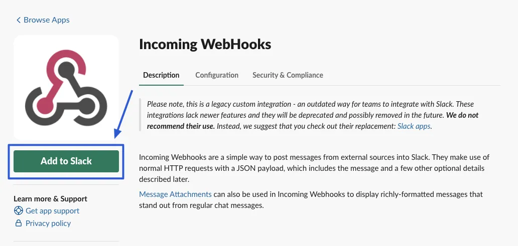 First, we need to add the Incoming WebHooks App to the Slack Channel. We will use this to send messages.