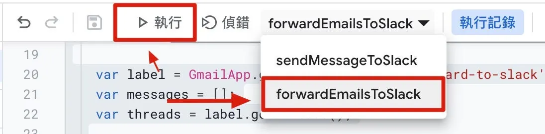 In the Apps Script code editor, select “forwardEmailsToSlack” and then click the “Run” button
