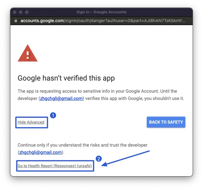 During the authentication process, the message “Google hasn’t verified this app” may appear. This is normal because the App Script we wrote has not been verified by Google. However, it’s fine since this is for personal use.