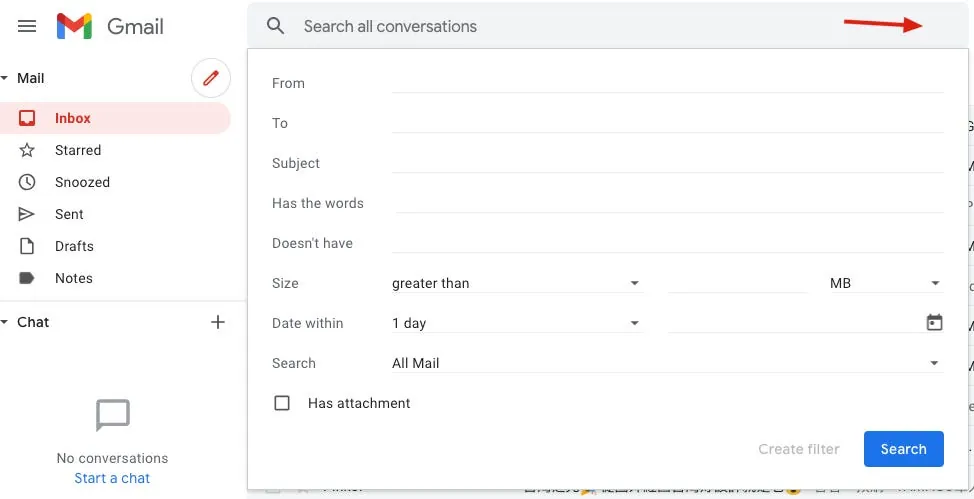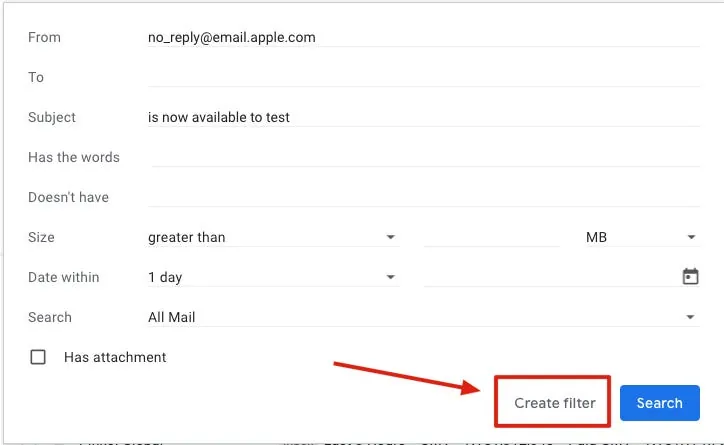 In Gmail, click the advanced search icon button at the top right, enter the forwarding email rule conditions, such as From: [email protected] + Subject contains is now available to test., then click “Search” to check if the filter results are as expected; if correct, click the “Create filter” button next to Search.