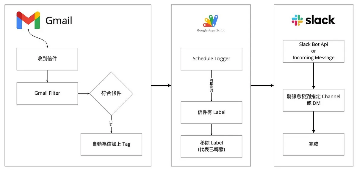 The complete process is shown in the above image and is feasible in principle; however, this article will focus on receiving emails and using Apps Script to forward them to a Slack channel.
