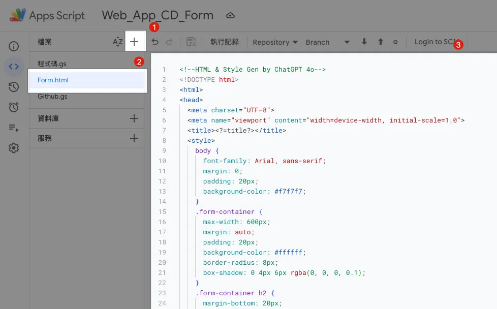 In the GAS file list on the left, click “+” to add a new file, enter the file name Form.html, and paste the GPT-generated HTML form template content.
