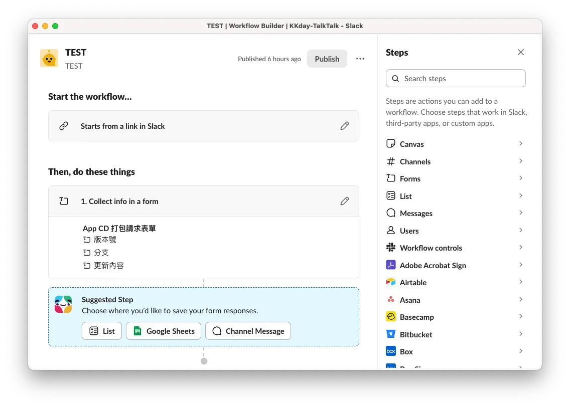 Also tried Slack’s built-in automation feature Workflow Form, but it cannot support dynamic form content (e.g., fetching branches for user selection). The only customizable part is the subsequent data submission step.