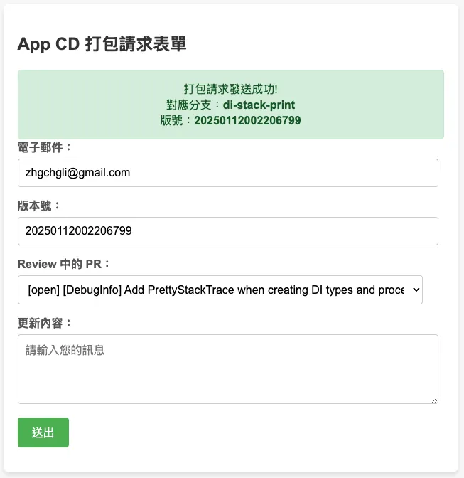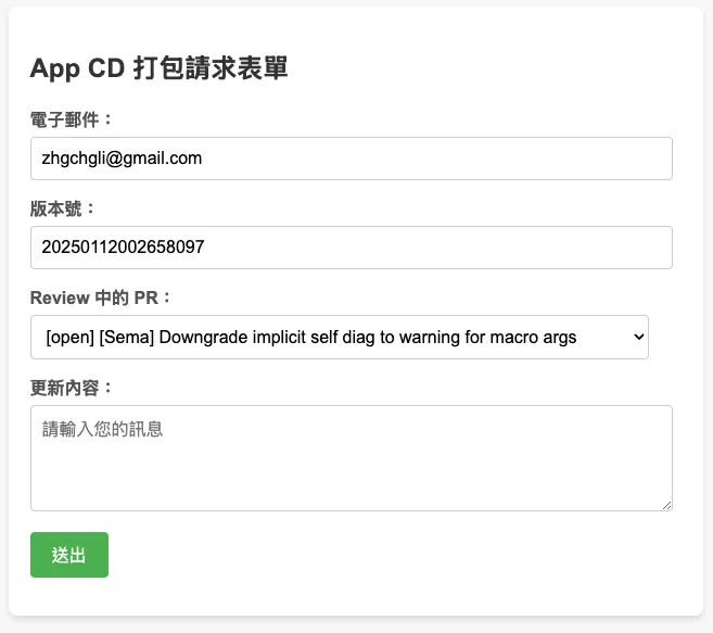 We use Google Apps Script Web App to build a CI/CD form, directly linked to Google Workspace accounts, restricting access to users within the organization. It automatically obtains the current logged-in user’s email, uses a shared GitHub Repo account (or borrows a personal access token from an authorized account) to call the GitHub API to get the branch list. Upon submission, it also calls the API to trigger GitHub Actions to start the CI/CD workflow.