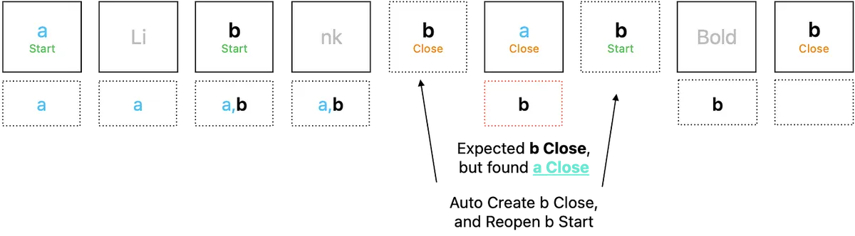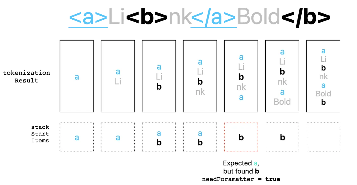 At first, I didn’t think much and planned to use regex to extract “paired” HTML tags directly, then recursively search layer by layer inside until the end. However, this approach couldn’t handle nested HTML tags or support error tolerance for misaligned tags. Therefore, we changed the strategy to extract “single” HTML tags, record whether they are Start Tags, Close Tags, or Self-Closing Tags, and combine other strings into a parsed result array.