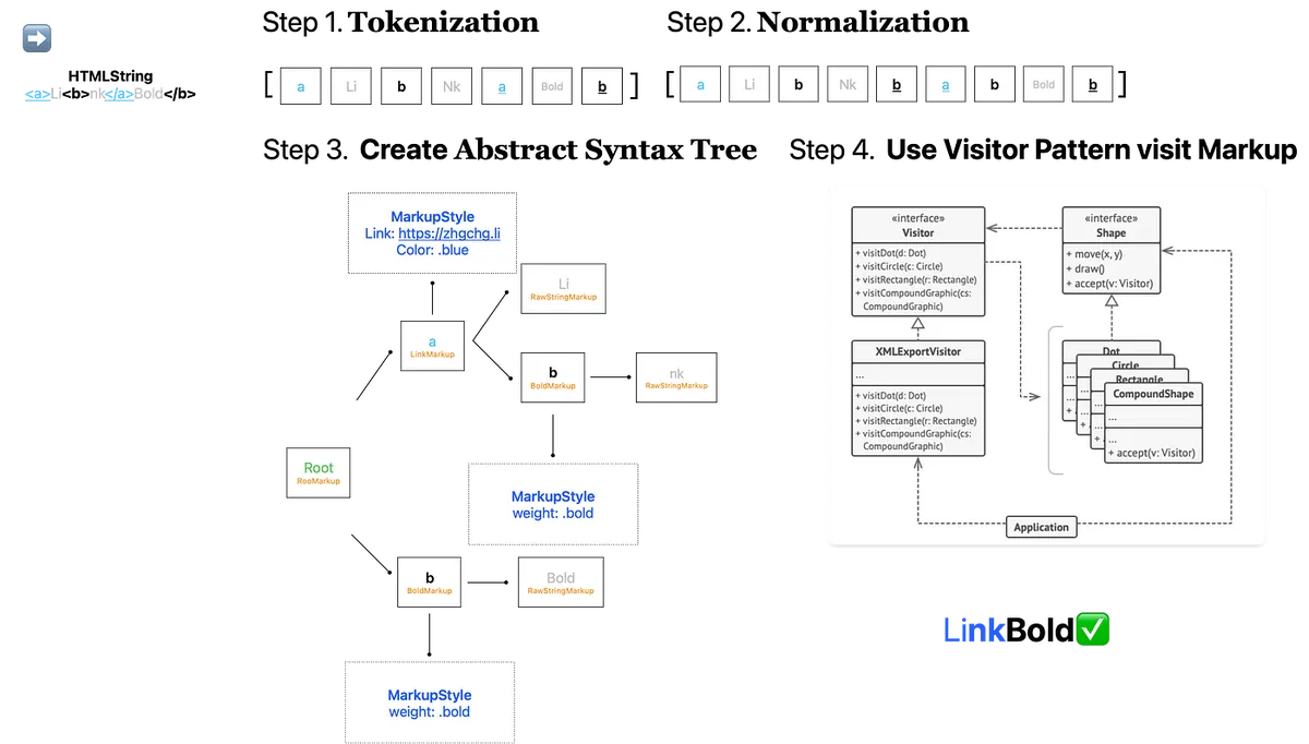 Developed purely in Swift, it uses Regex to parse HTML tags and performs tokenization. It analyzes and corrects tag accuracy (fixing unclosed tags & misaligned tags), then converts them into an abstract syntax tree. Finally, it uses the Visitor Pattern to map HTML tags to abstract styles, resulting in the final NSAttributedString output; no parser libraries are used.