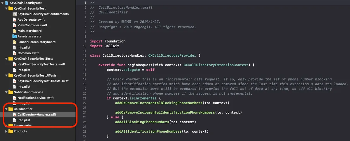 Open the Call Directory Extension folder and find the file CallDirectoryHandler.swift that has been created for you.