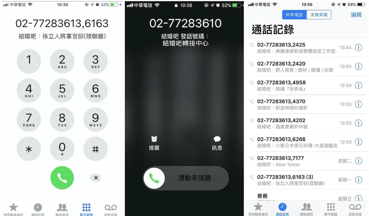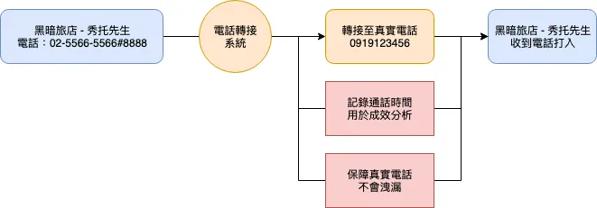 Our site ( 結婚吧 ) or my personal ( 591房屋交易 ) uses forwarding numbers for calls made by users to contact stores or landlords. The calls are routed through a transfer center to the target phone. The general process is as follows: