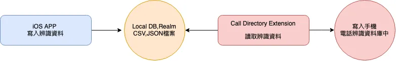 Unfortunately, you cannot directly write data to the Call Directory Extension. Therefore, you need to maintain a corresponding structure separately, and the Call Directory Extension will read your structure to write the identification data into the database. The process is as follows:
