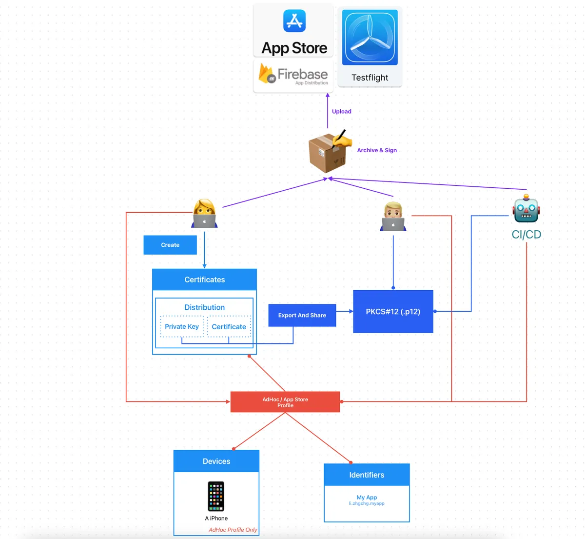 Ad Hoc — A provisioning profile for internal testing (e.g., Deploy to Firebase App Distribution), containing the relationship between Certificates, Identifiers, and Devices.