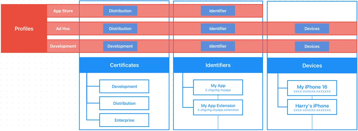 App Store — The provisioning profile used for packaging and uploading to the App Store / TestFlight, containing the relationship between Certificates and Identifiers.