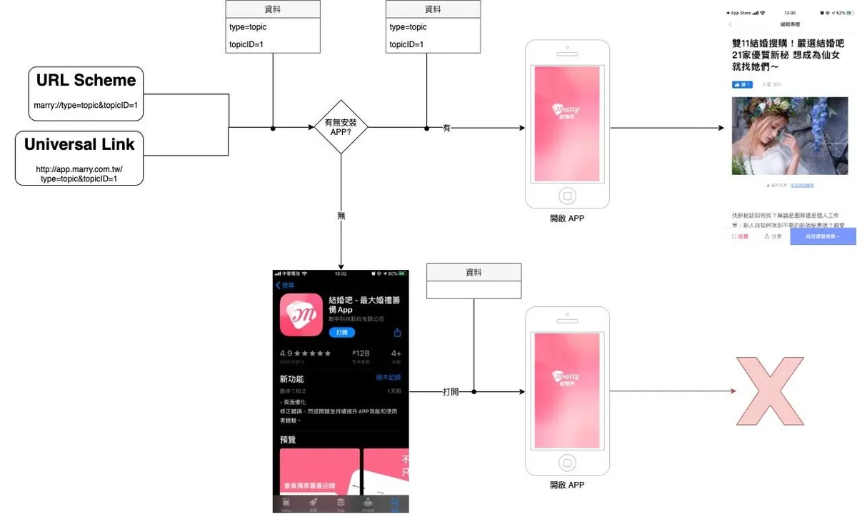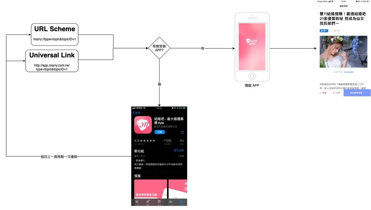 - When the user has the app installed and clicks a URL link (from Google search, FB post, Line link, etc.), the app should open directly to the target screen. If not installed, redirect to the App Store to install the app; after installation and opening the app, it should restore the previously intended screen.