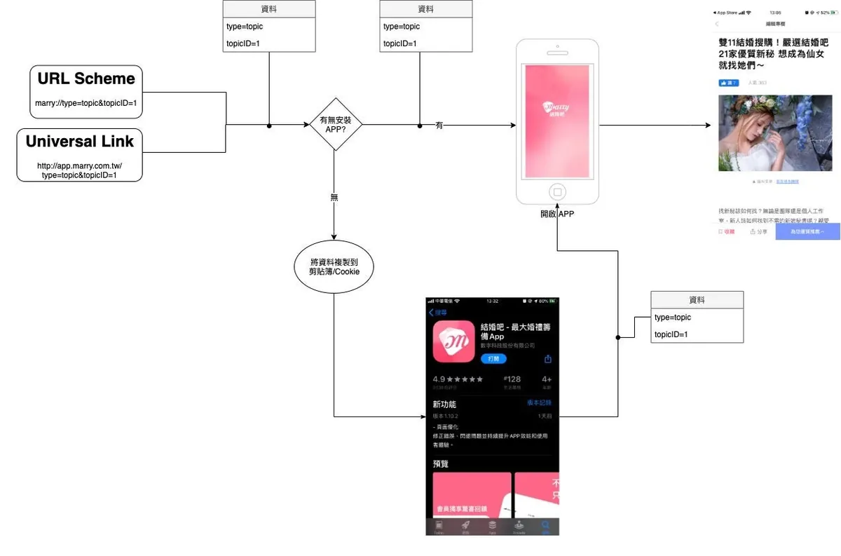 We customized our own page by imitating Firebase Dynamic Links. Using the clipboard.js library, when users click “Go Now,” the information we want to pass to the app (marry://topicID=1&type=topic) is first copied to the clipboard, then location.href is used to redirect to the App Store page.