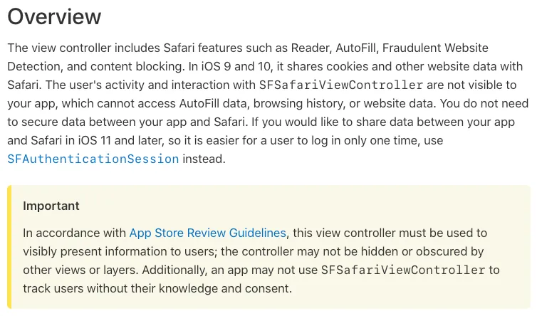 Also, app review does not allow placing SFSafariViewController where users cannot see it. (Triggering it programmatically and then adding it as a subview is not easily detected)