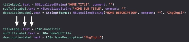 SwiftGen helps us change the original NSLocalizedString string access method to object access, preventing typos and missing key declarations.