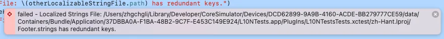 XCTFail("Localized Strings File: \(otherLocalizableStringFile.path) has redundant keys.")