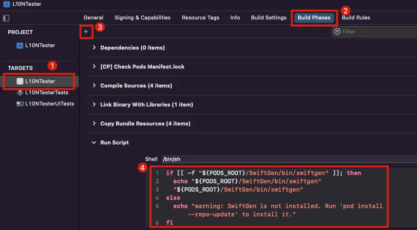 swiftgen does not need to be placed in the build phase because it runs every time you build, and the code only appears after the build is complete. You can change it to run the command only when there are adjustments.