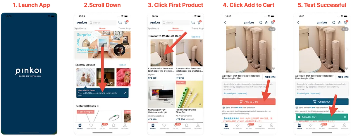 Launch App -> Home -> Scroll Down -> Similar to Wish List Items Section -> First Product -> Click First Product -> Enter Product Page -> Click Add to Cart -> UI Response Added to Cart -> Test Successful ✅