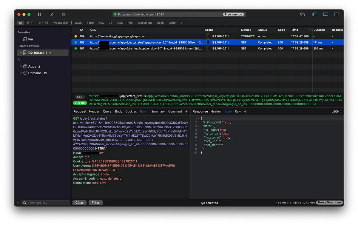 Everything starts with sniffing. For this part, you can refer to the previous articles “APP uses HTTPS transmission, but data is still stolen.” and “Using Python + Google Cloud Platform + Line Bot to automate routine tasks”. The first article explains the principle, and it is recommended to use Proxyman from the second article for sniffing.