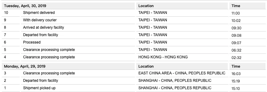The official estimated delivery time is: 5/3~5/10. On 4/29, I was notified that the shipment left Shanghai. Luckily, I received it on 4/30, just before the Labor Day holiday on May 1st (super fast!! From Shanghai to Taipei).