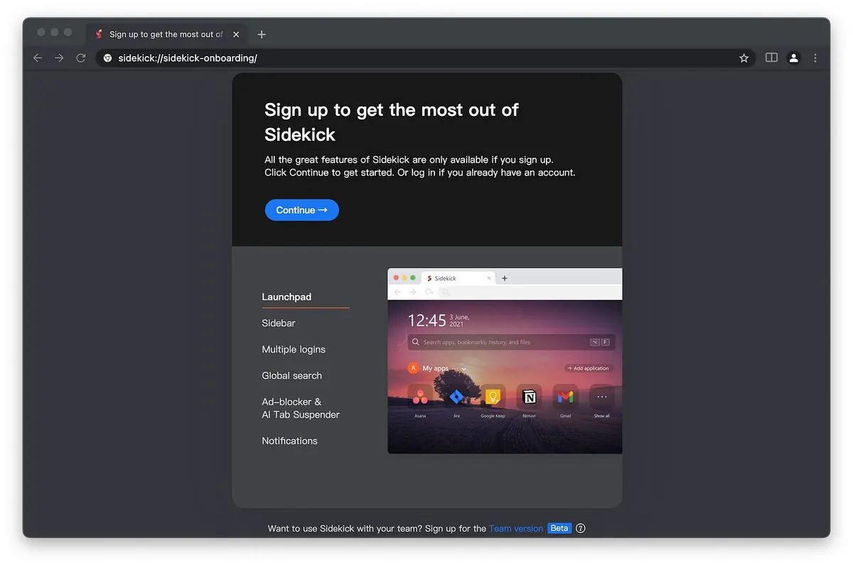 The Sidekick introduction page appears. Click “Continue” at the top to proceed.