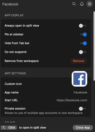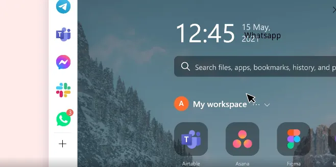 Not just a quick access to websites, it works like the MacOS Dock. When an Application website is activated, it stays resident in the browser (indicated by a small dot on the left) while managing memory efficiently. If the active website has notifications, it will display a numbered badge as an alert.