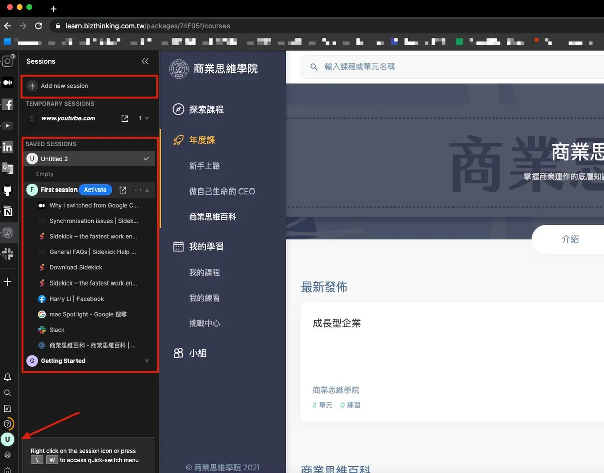 Click “Add new session” above to save the current Tab state and open a fresh, clean browsing environment.