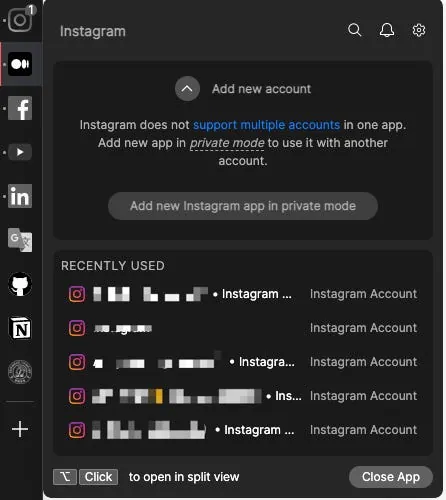 Few websites support multi-account switching; if unsupported, use Private Mode first. Currently tested Slack and Notion both support it.