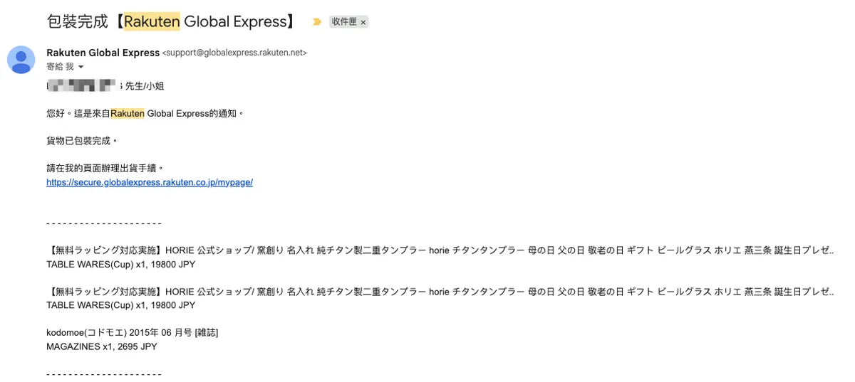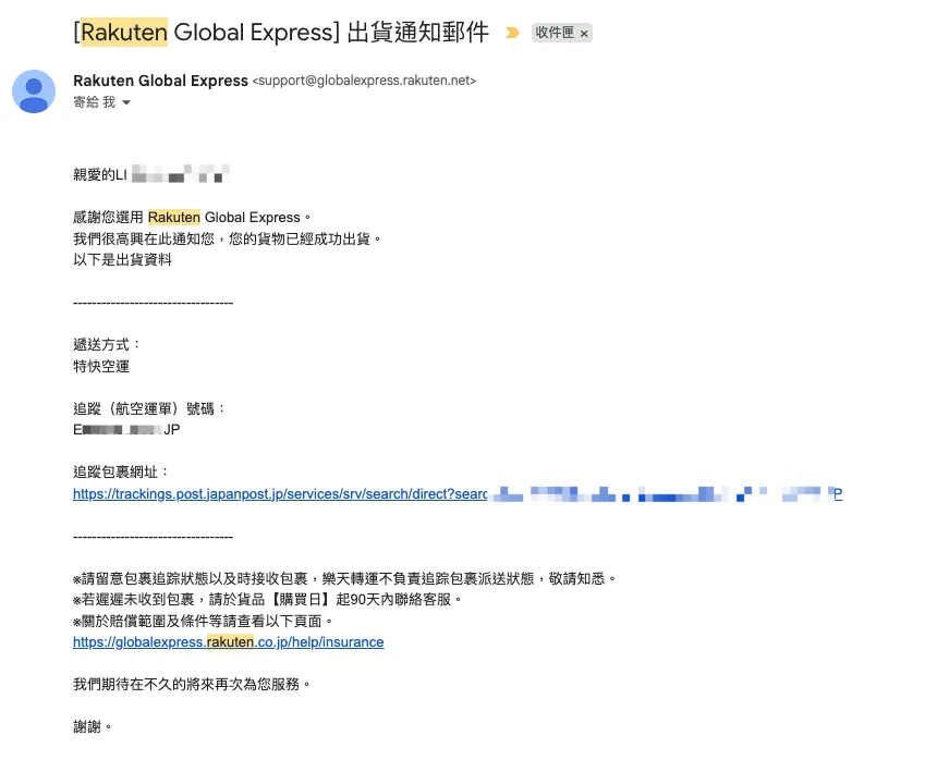After Rakuten completes the shipment, you will also receive a notification with a tracking number to check the status of your package.