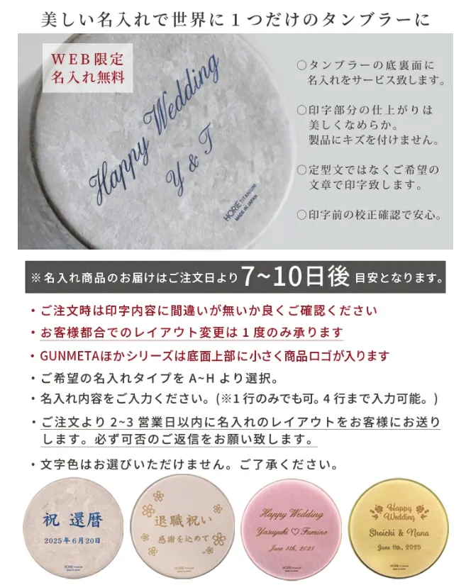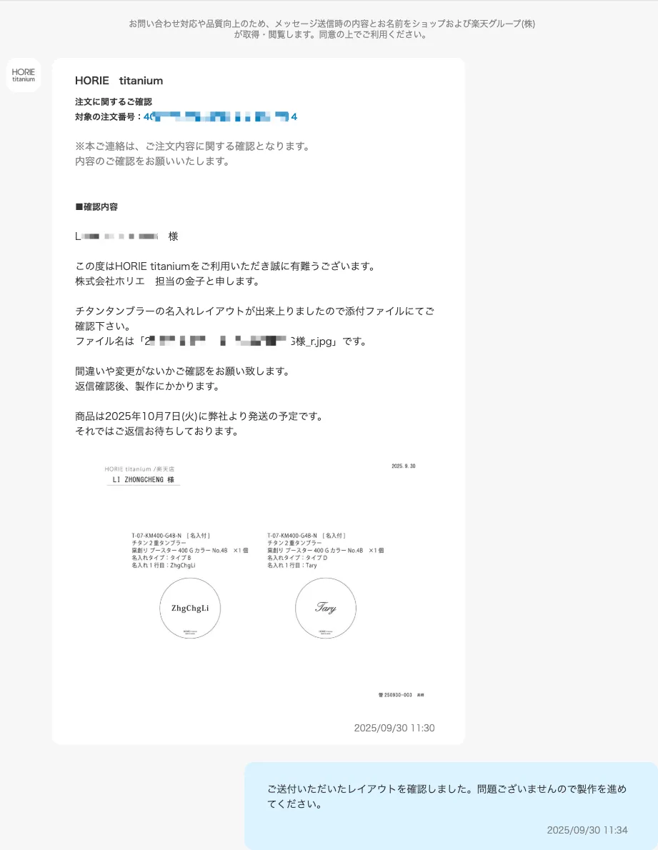 If you choose to have engraving, HORIE will send you a confirmation after receiving the order. If everything is fine, you can reply with “ご送付いただいたレイアウトを確認しました。問題ございませんので製作を進めてください。” to let them start production.