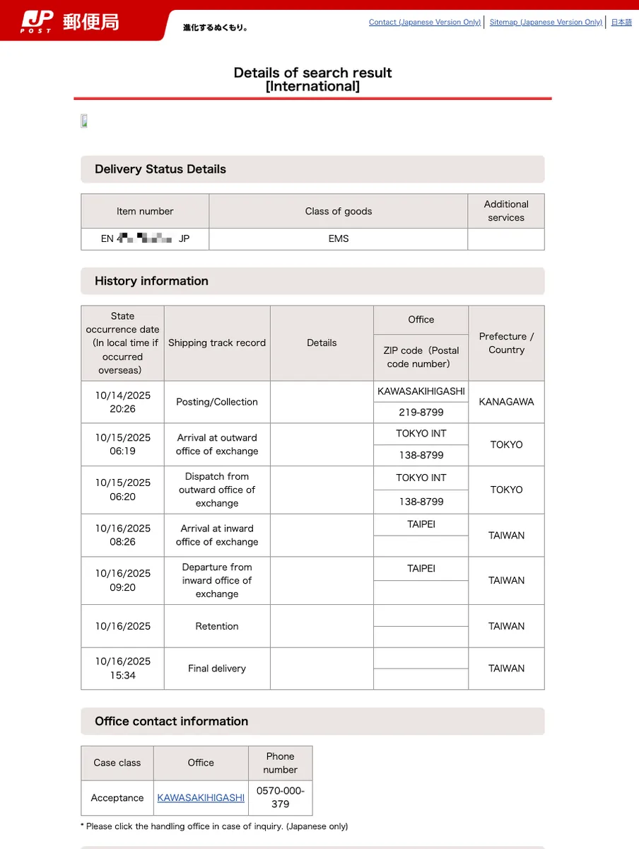 According to a friend’s advice, if you use DHL, remember to apply for tax payment before release to avoid extra handling fees if customs inspects and charges additional taxes.EMS Express Air Shipping: 3–8 days, 6,550 JPY (I chose this, actually received in 2 days, very fast)