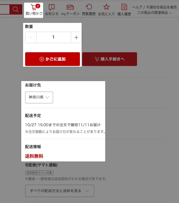 After filling in all the specifications, click “かごに追加” to add to the cart. For the delivery address, select our Rakuten forwarding service’s “Kanagawa Prefecture.” Below, the estimated delivery time to Rakuten forwarding and free shipping will be shown. Once everything is set, click the cart icon above to proceed to checkout: