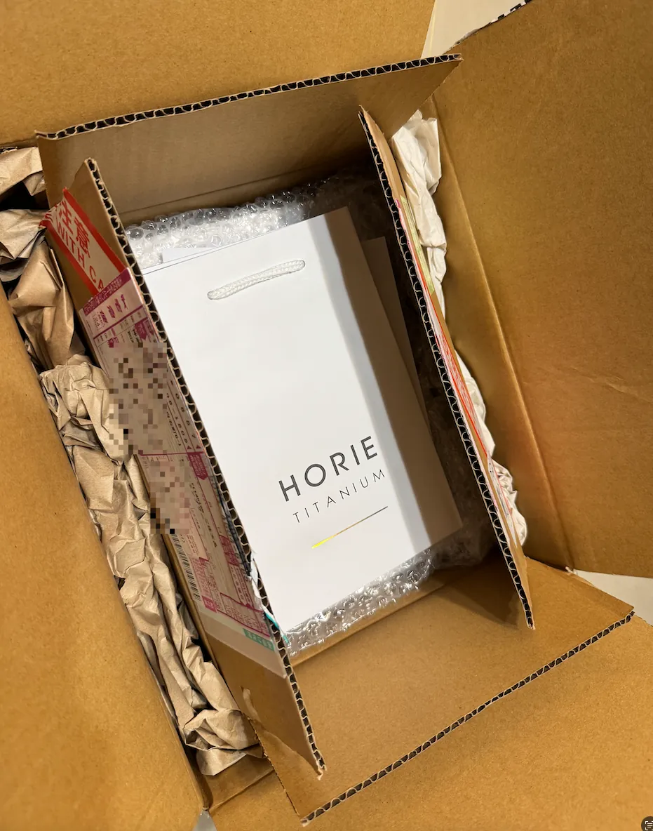 The Horie titanium cup’s original sealed box is placed intact inside the Rakuten forwarding box.