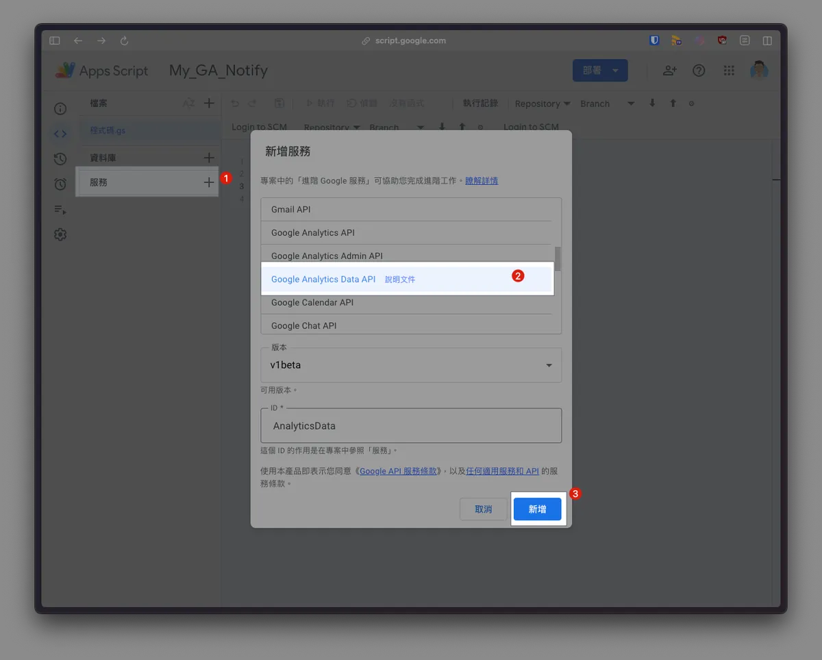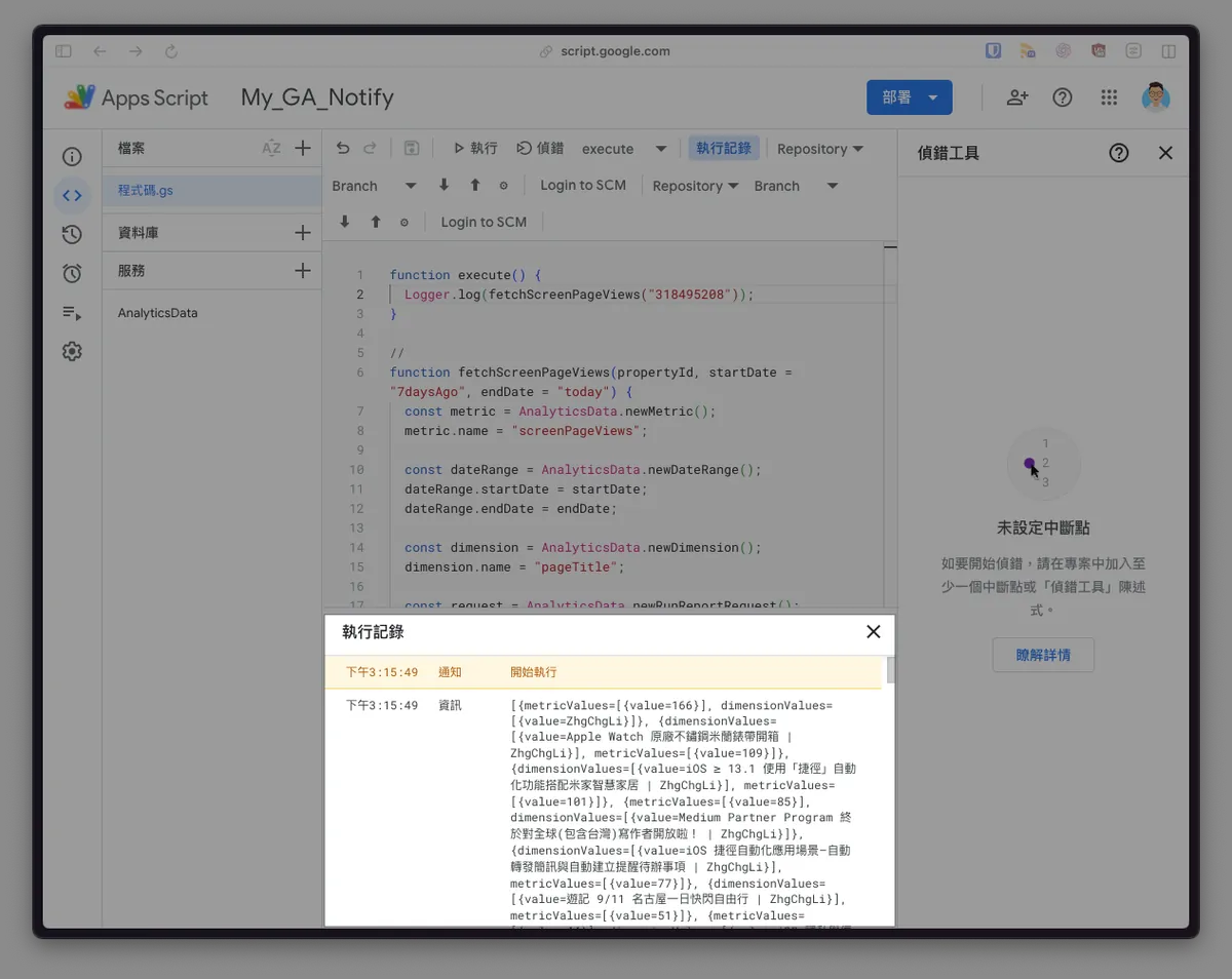This article is just a brief piece. For a complete automated data report, please refer to the previous article “Using Google Apps Script to Implement Daily Data Report RPA Automation”. Also, a previous integration with GA4 to fetch the App Crash-free rate can be found in the article “Crashlytics + Google Analytics Automated Query for App Crash-Free Users Rate”.