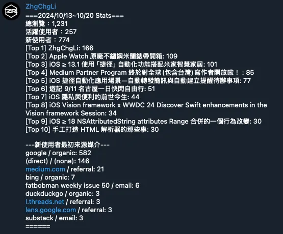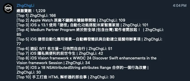 The integration scenario introduced this time follows the previous article “10-Minute Quick Migration from Line Notify to Telegram Bot Notifications”. I realized that my Medium backup site “zhgchg.li” has never had its GA4 website data monitored. I thought it would be good to create another notification bot to send the past 7 days of website data daily to a specified Telegram Channel to keep me informed.