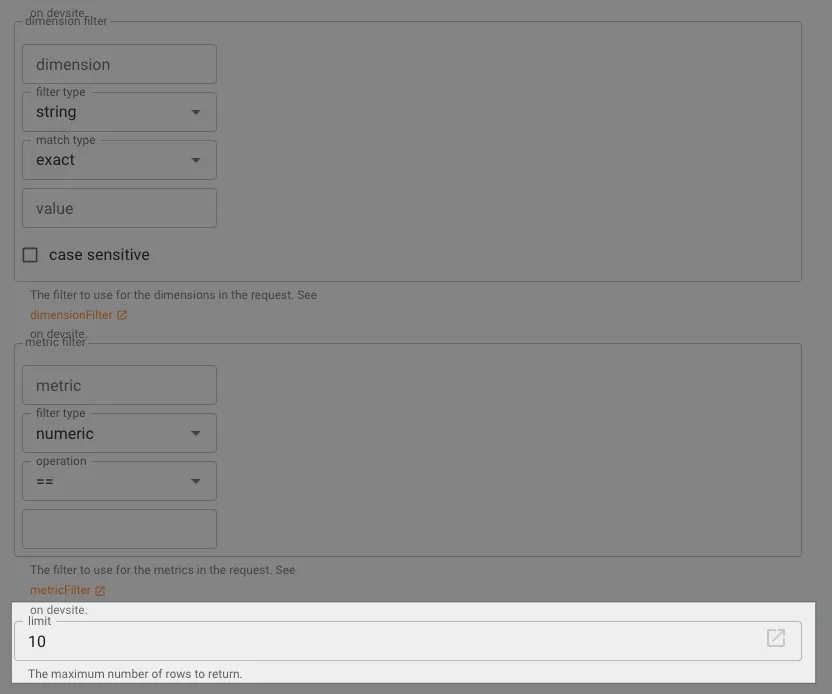 filter I don’t need, leave blank; limit I enter 10 because I only want to know the Top 10.
