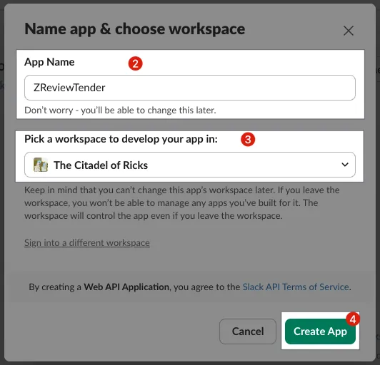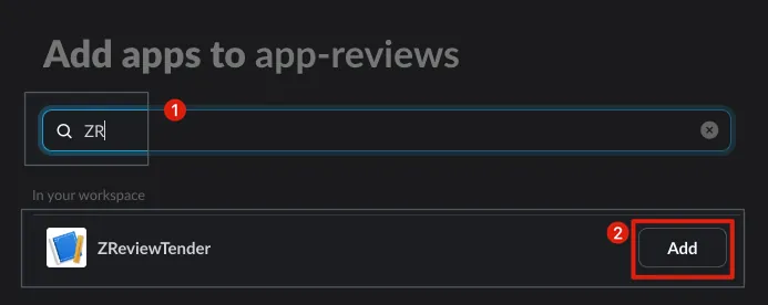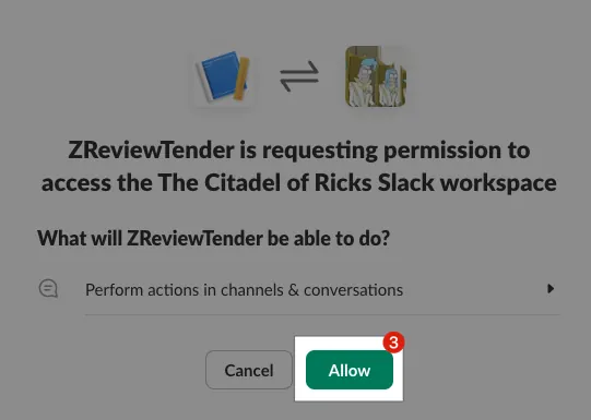 ZReviewTenderor a custom Slack App nameSelect the target Slack Workspace for installation: Please make sure you have permission to add a Slack App to the Workspace you choose.