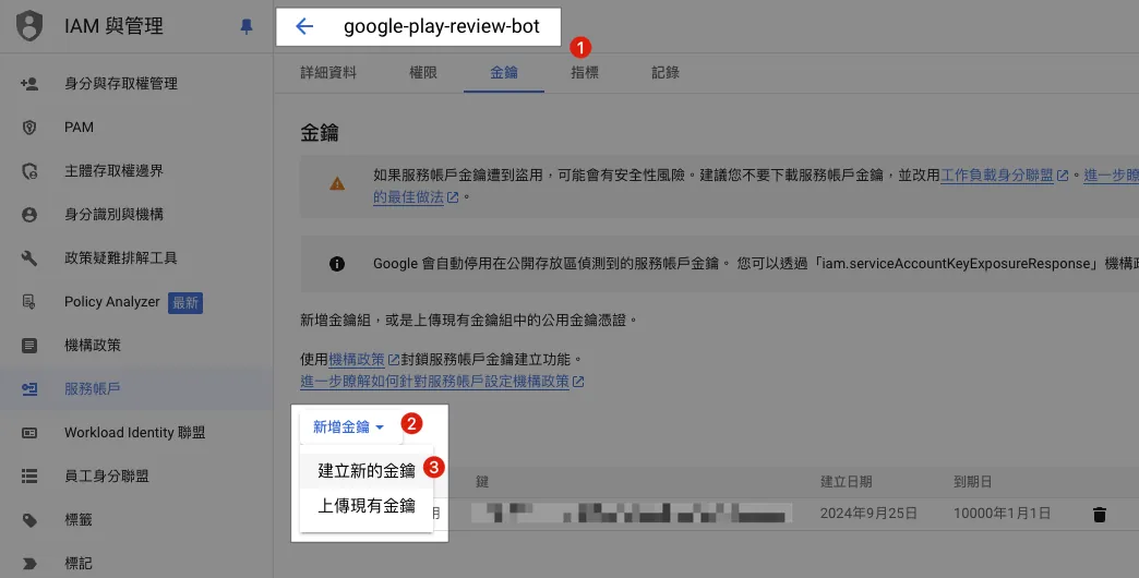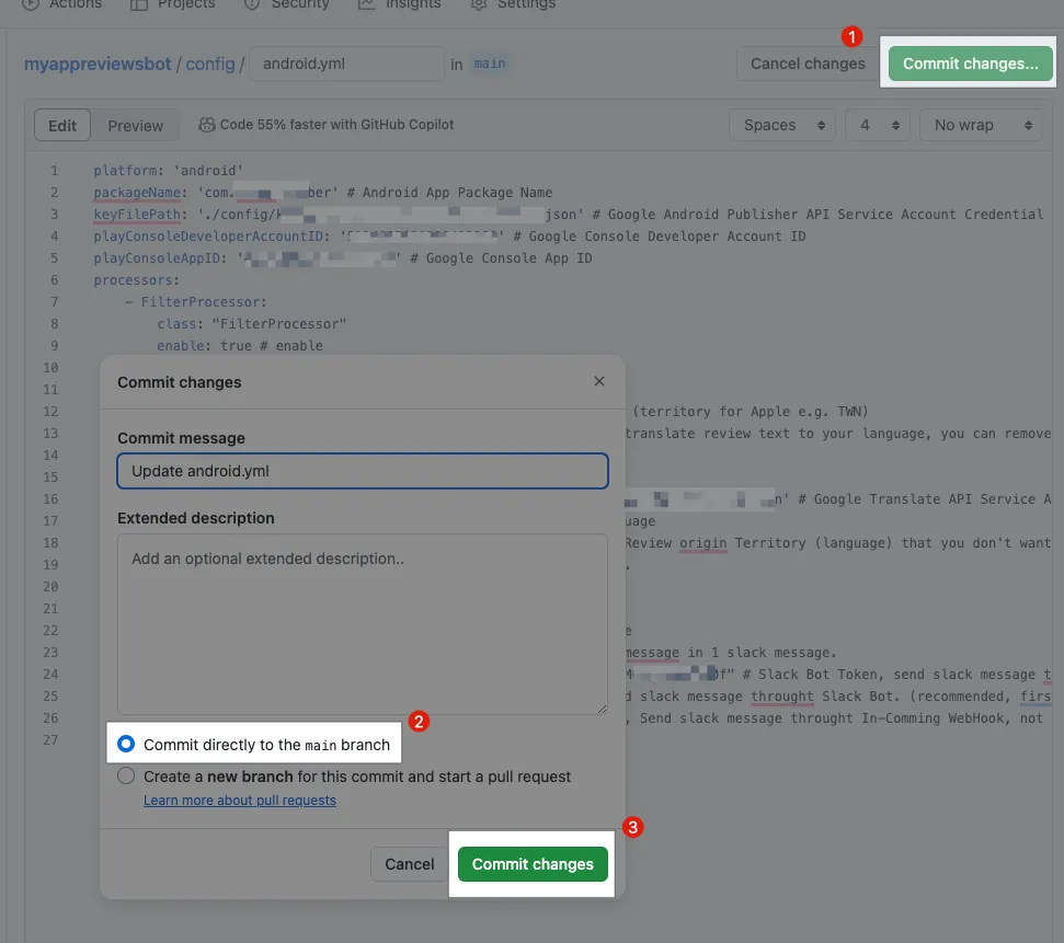 Enter./config/XXXX-XXXX.json(Step 2. TheXXXX-XXXX.jsonService Account key file name saved from GCP IAM)playConsoleDeveloperAccountID: Step 2. TheDeveloper IDobtained from the Google Play Console backendplayConsoleAppID: Step 2. TheApp IDobtained from the Google Play Console backendslackBotToken: Enter theSlack App Bot User OAuth Tokennoted in Step 1.slackBotTargetChannel: Enter theChannel IDnoted in Step 1 to send messages to