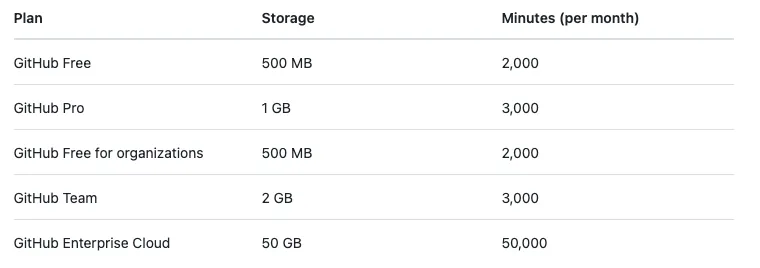 GitHub Free provides basic 500 MB Storage (for CI/CD Artifacts) and 2,000 minutes of execution time per month.