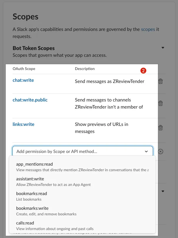 Enter the three required scopes for adding the ZReviewTender Slack App in order: