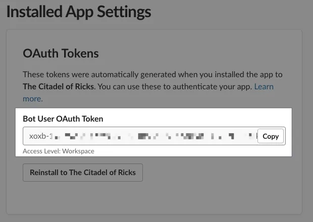After installation, return to the Install App page where the Slack App Bot User OAuth Token will appear. Click “Copy” to copy it, make sure to save it for later use.