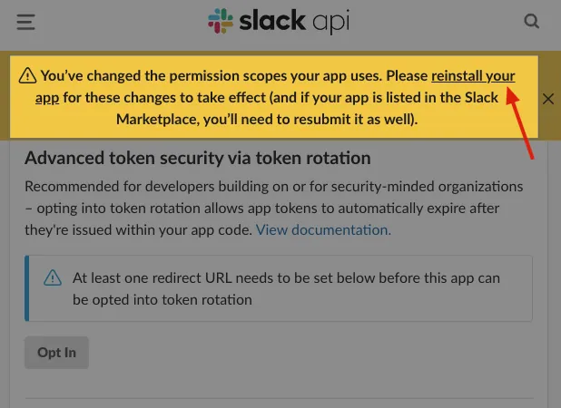 If OAuth & Permissions Scopes are updated, you need to click “reinstall your app” to apply the changes: