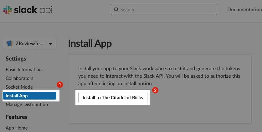 Go back to the Install App tab to install the Slack App into your Workspace.