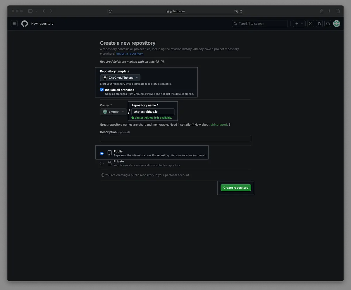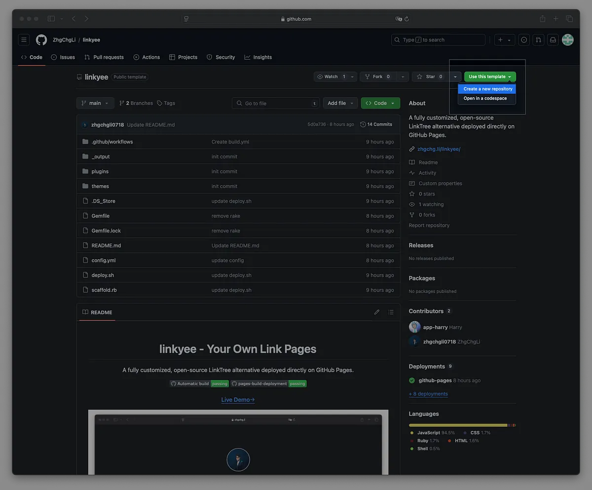 Step 1. Click the “Use this template” button at the top right of the linkyee template library -> “Create a new repository”: